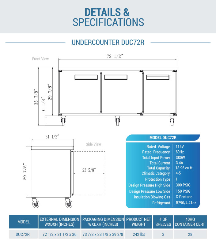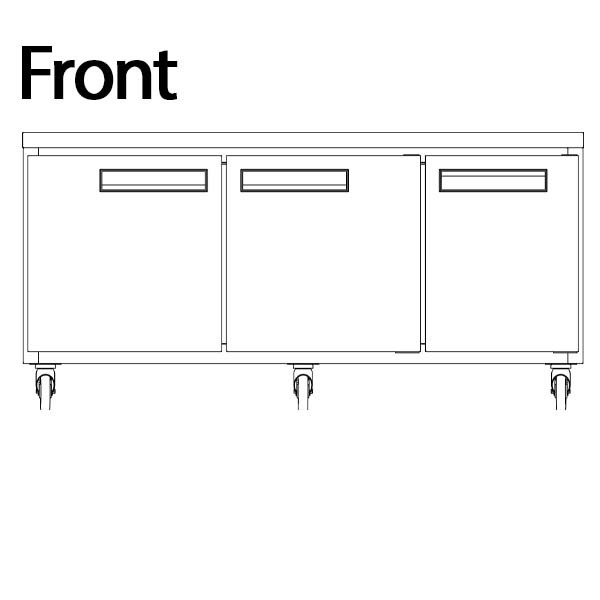 reach-in, three-section, 72"W, rear mounted self-contained refrigeration, digital temperature control, 33°F (0.5°C) to 41°F (5°C) temperature range, automatic defrost, (3) solid self-closing doors, (3) adjustable shelves, stainless steel interior & exterior, 5" casters (2 braked), R290 refrigerant, 1/4 HP, 110v/60/1-ph, cETLus, ETL-Sanitation, ENERGY STAR®