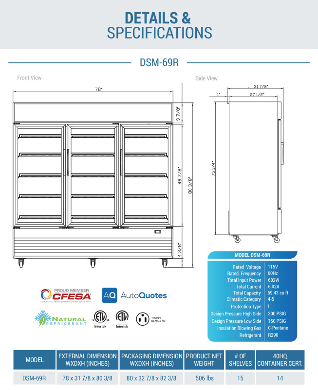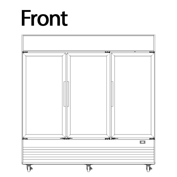 reach-in, three-section, 78"W, bottom mount self-contained refrigeration, digital control, 32°F (0°C) to 50°F (10°C) temperature range, automatic defrost, (3) hinged tempered glass doors with replaceable gaskets, installed door lock, adjustable shelves, interior & canopy LED light with switch, white interior, black exterior, casters, R290 refrigerant, cETLus, ETL-Sanitation